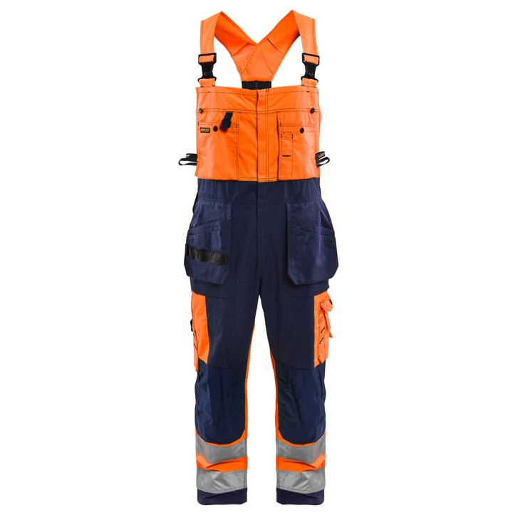 Tulajdonságok: hi-vis kantáros nadrág CORDURA® megerősített térdekkel és hátzsebekkel, két szintű térdvédő zsebek, széles gumipántos vállpántok, kalapácstartó, mérőzseb kés és tolltartóval, D-karika, redőzött hátsó zsebek, elrejthető elülső szerszámzsebek, robusztus rejtett kétirányú fém cipzár, 70 mm széles fényvisszaverő csíkok