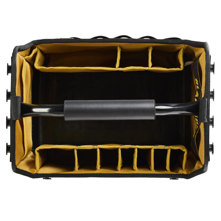 Tulajdonságok: Strapabíró szerszámtáska; nyitott, stabil kialakítás; moduláris ToolRig™ rögzítési rendszer; vízálló talp; világos belső tér; többméretű rekeszek; vállpánttal és párnázott fém fogantyúval