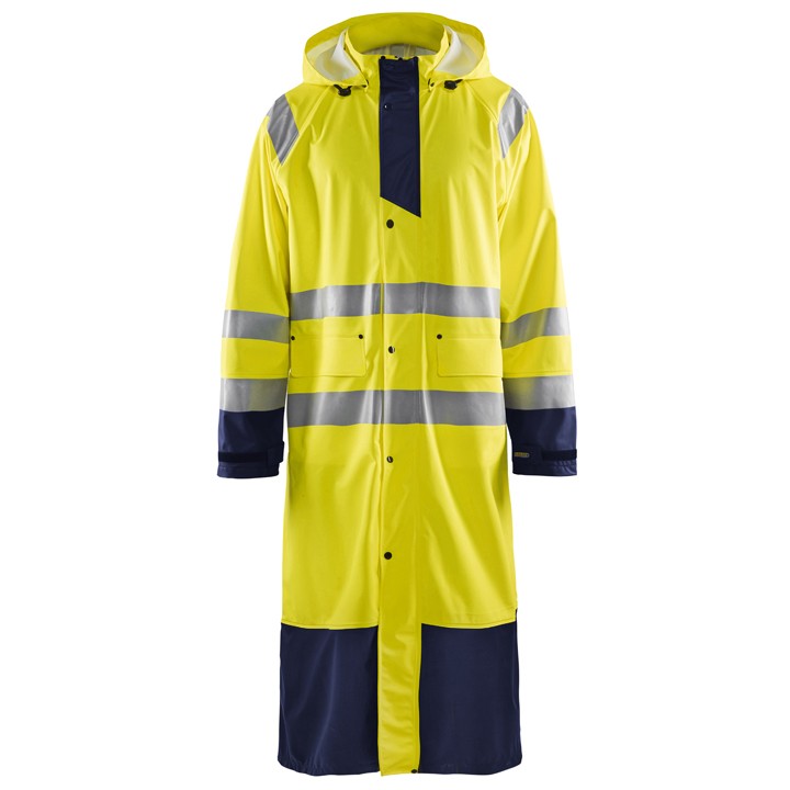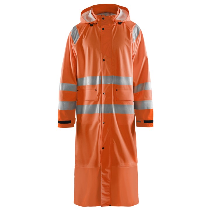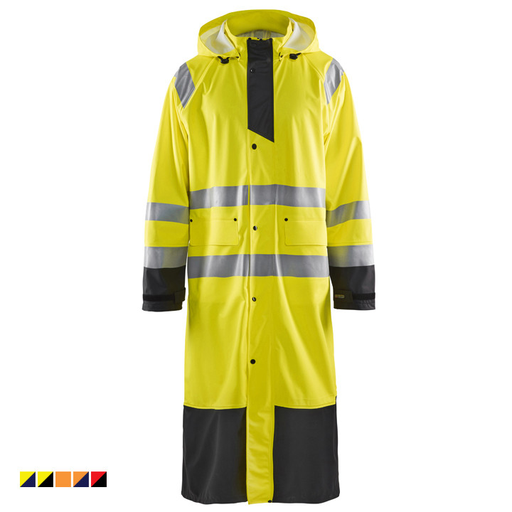 Tulajdonságok: Könnyű, mozgékony munkás esőkabát hegesztett varrásokkal; levehető, állítható kapucni; két elülső zseb fedéllel; rejtett kétirányú cipzár; állítható mandzsetták; hővel applikált fényvisszaverő csíkok 50 mm és 65 mm